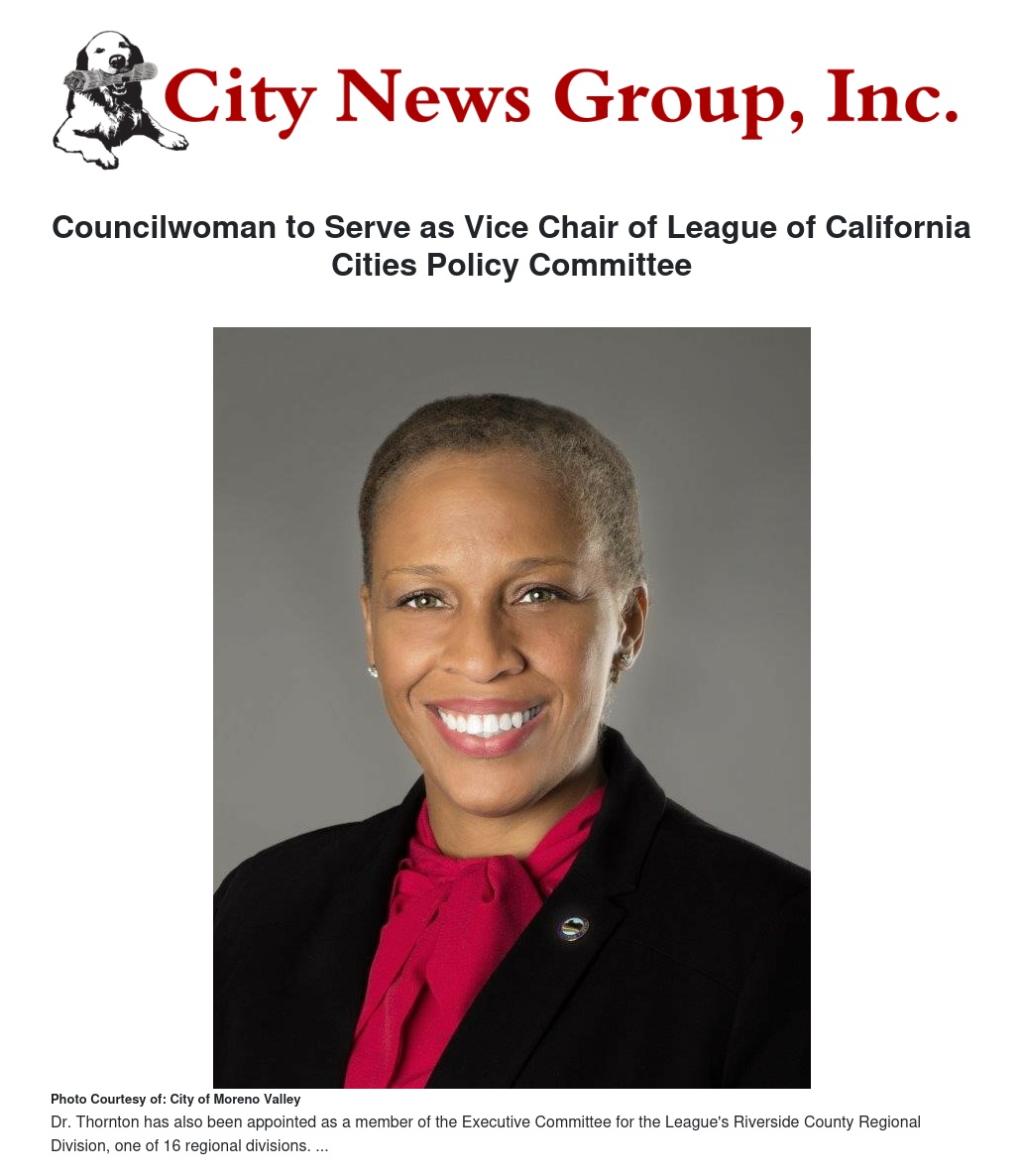 "As the 21st largest City in California, it's appropriate that we have a seat at the League's policy-making table," said Dr. Yxstian Gutierrez, Mayor of Moreno Valley. "Councilwoman Thornton will be a strong advocate for our City and our residents."
