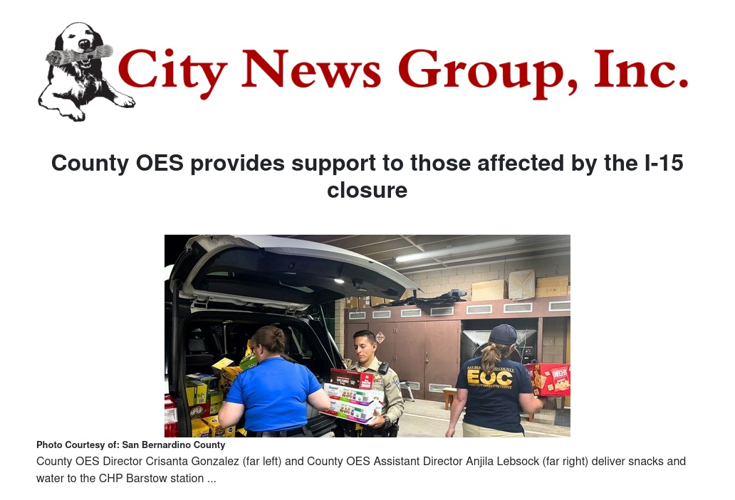 Chief Evans quickly notified the OES Duty Officer, who began coordinating efforts to find safe county locations and staff to drop off water. With cooperation from County Fire and Airports, two drop off locations were identified, and County OES staff were quickly dispatched to the OES warehouse to load multiple trucks with pallets of water for distribution to the sites. In total, nine pallets of water were delivered. County OES staff was also able to coordinate a half pallet of snacks for pets and humans delivered for distribution to the CHP Barstow station in support of this incident.