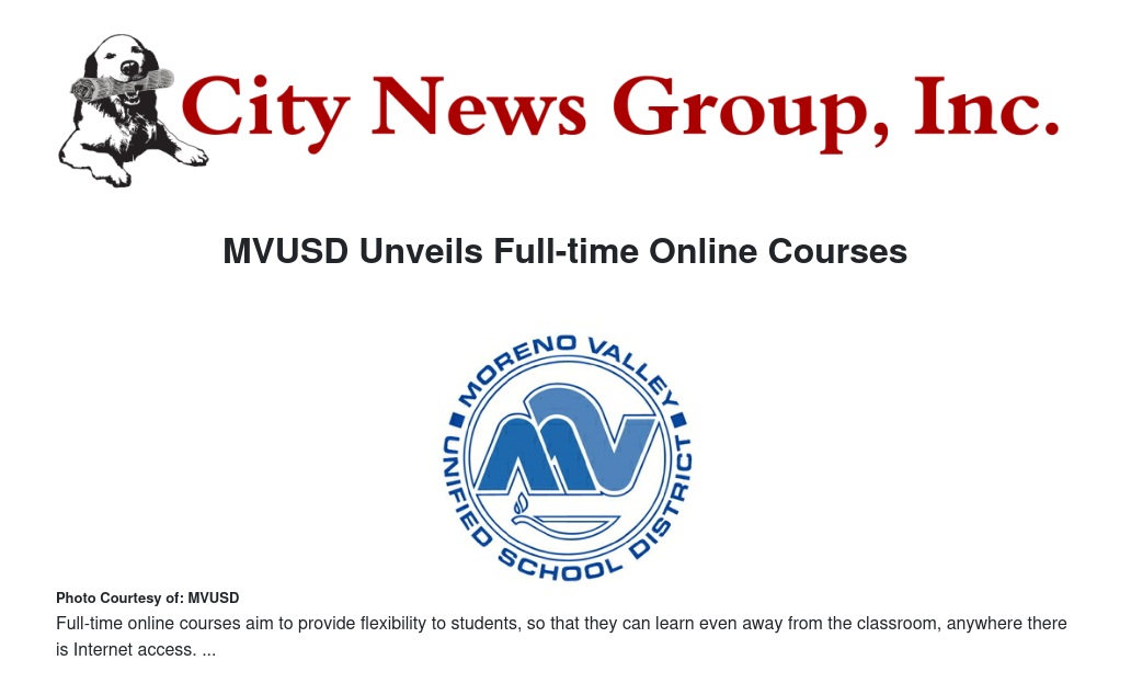 Moreno Valley Unified School District (MVUSD) announced it is opening the Moreno Valley Online Academy and the Graduation Opportunity School. The Moreno Valley Online Academy is open to students in K through 10th grade and the Graduation Opportunity School is for 11th and 12th grade students who have 110 or fewer credits. The program will also accept fifth year seniors who want to earn a high school diploma.