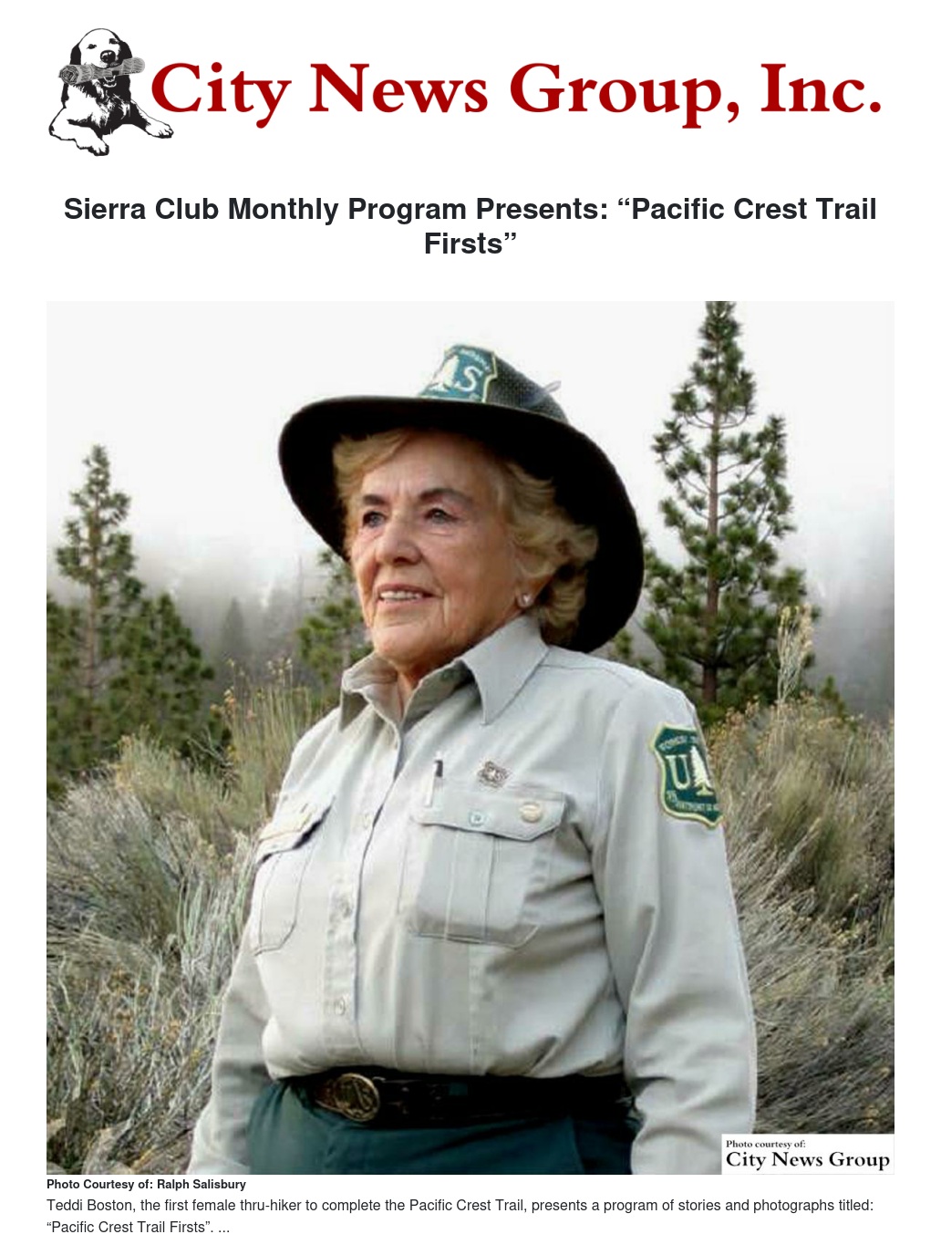 On Tuesday, Jan. 5, 2016 the San Gorgonio Chapter of the Sierra Club will have their monthly meeting at the San Bernardino County Museum, 2024 Orange Tree Lane, Redlands at 7:30 p.m. Join us as Teddi Boston, the first female thru-hiker to complete the Pacific Crest Trail, presents a program of stories and photographs titled: “Pacific Crest Trail Firsts”.