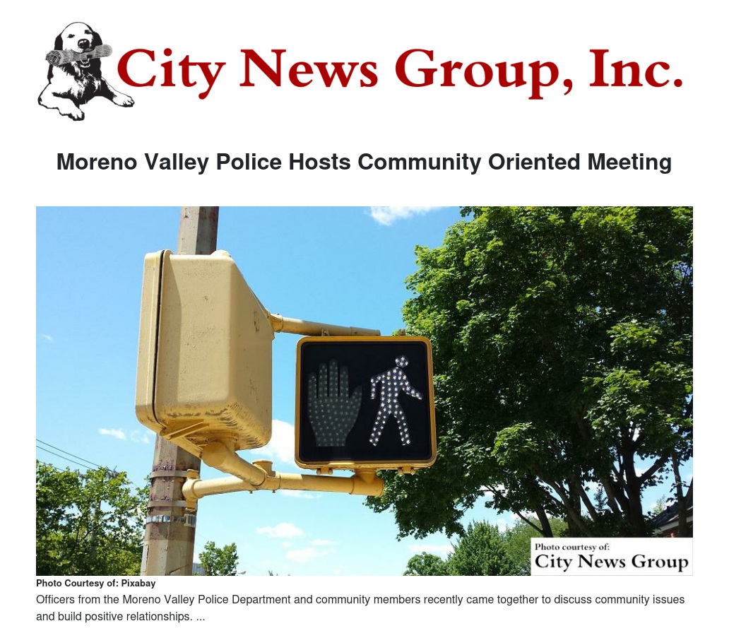 "The Moreno Valley Police Department is committed to enhancing the delivery of quality service to the community we serve," the department said in a statement. "The police department’s goal is to educate residents on community oriented policing and how officers and the community can work together in creating safer neighborhoods. This meeting (gave) residents an opportunity to voice their concerns, and meet the Chief of Police and zone officers who patrol their neighborhoods."