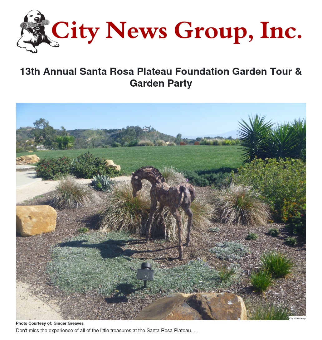Tickets are on sale now at www.srpf.org or may be purchased the Santa Rosa Plateau Visitor Center, 39400 Clinton Keith Road. Tickets are also available by phone at (800) 369-4620. General admission garden tour tickets, including the garden party site are $25 for Foundation members and $35 for non-members. Day of the event tickets are $40.