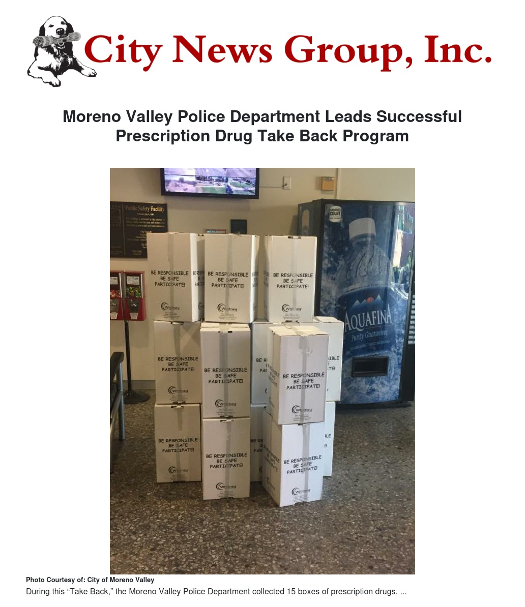 During this “Take Back,” the Moreno Valley Police Department collected 15 boxes of prescription drugs. All too often prescription drugs make their way onto the streets and are illegally used by those without a proper prescription. This program is just one of the many ways the Moreno Valley Police Department works to keep the community safe.