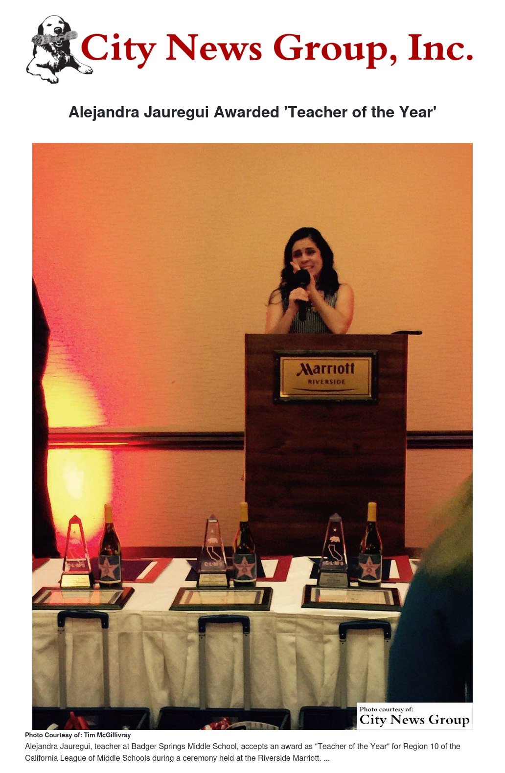 Alejandra Jauregui, teacher at Badger Springs Middle School, has been selected as "Teacher of the Year" for Region 10 of the California League of Middle Schools (CLMS).