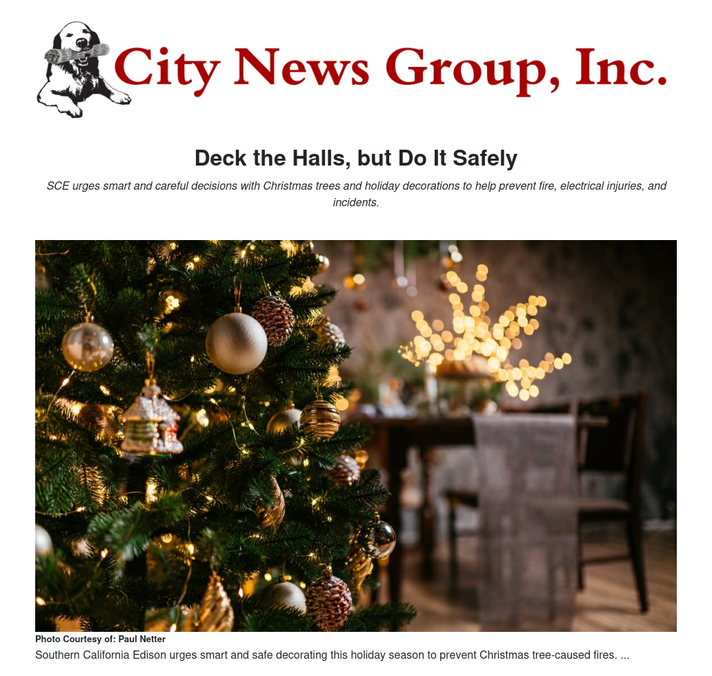 Southern California Edison urges smart and safe decorating this holiday season to combat the 160 reported home Christmas tree fires nationwide that annually cause an average of two deaths, 11 injuries and $12 million in property damage.