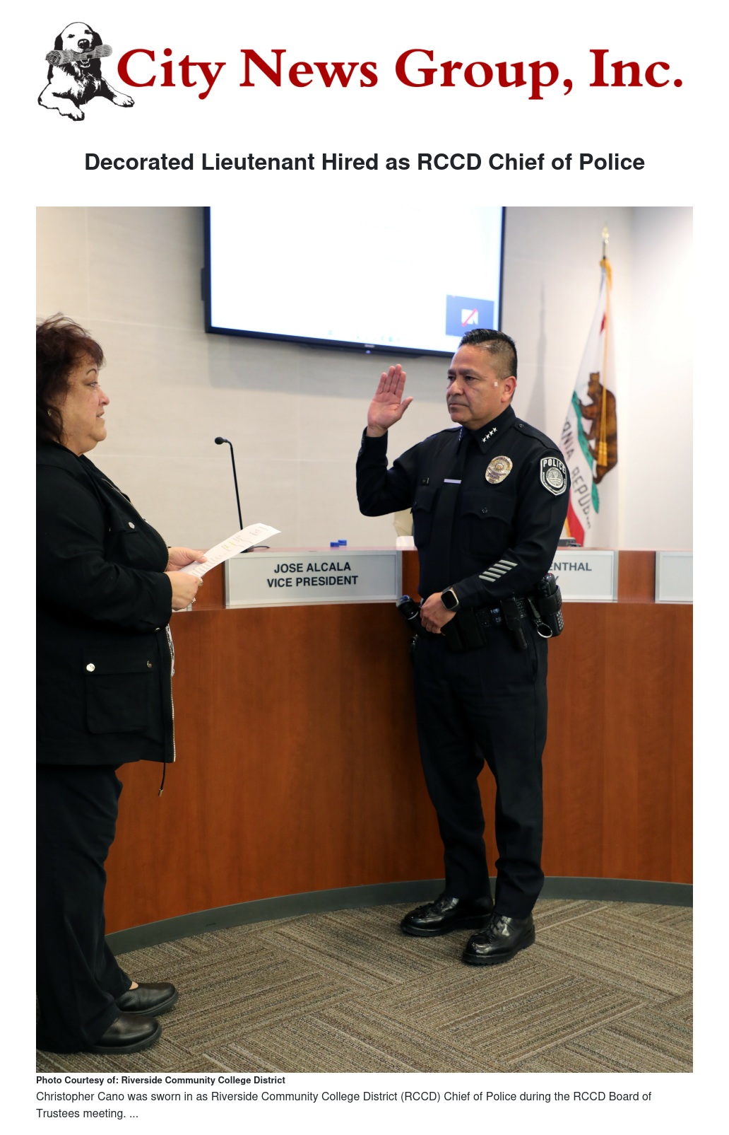 Christopher Cano, a lieutenant with the El Monte Police Department, has been hired as the Riverside Community College District (RCCD) chief of police. The new chief was sworn in during the RCCD Board of Trustees meeting on Tuesday, March 21.