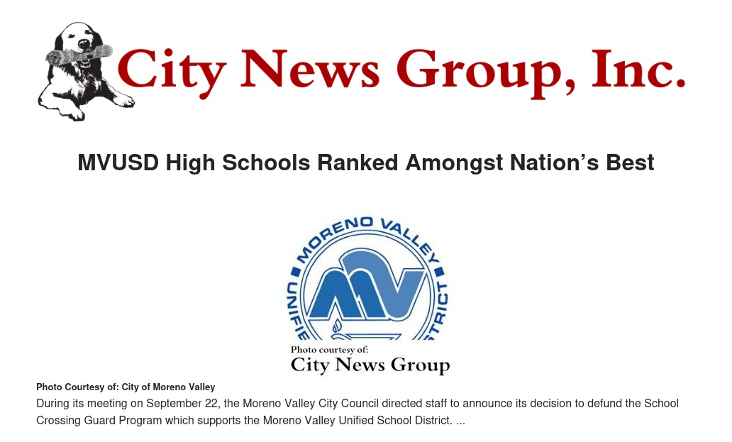 Out of the almost 30,000 public high schools in America, the four in Moreno Valley Unified are ranked among the very best by U.S. News & World Report.
