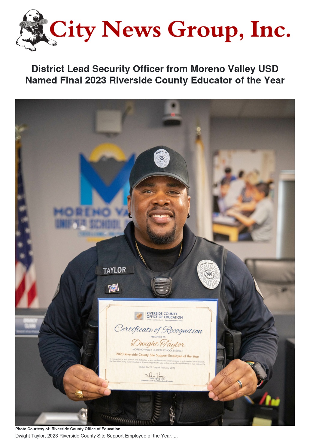 - Riverside County Site Support Employee of the Year: Dwight Taylor, District Lead Officer-Campus Security Officer II, Moreno Valley Unified School District