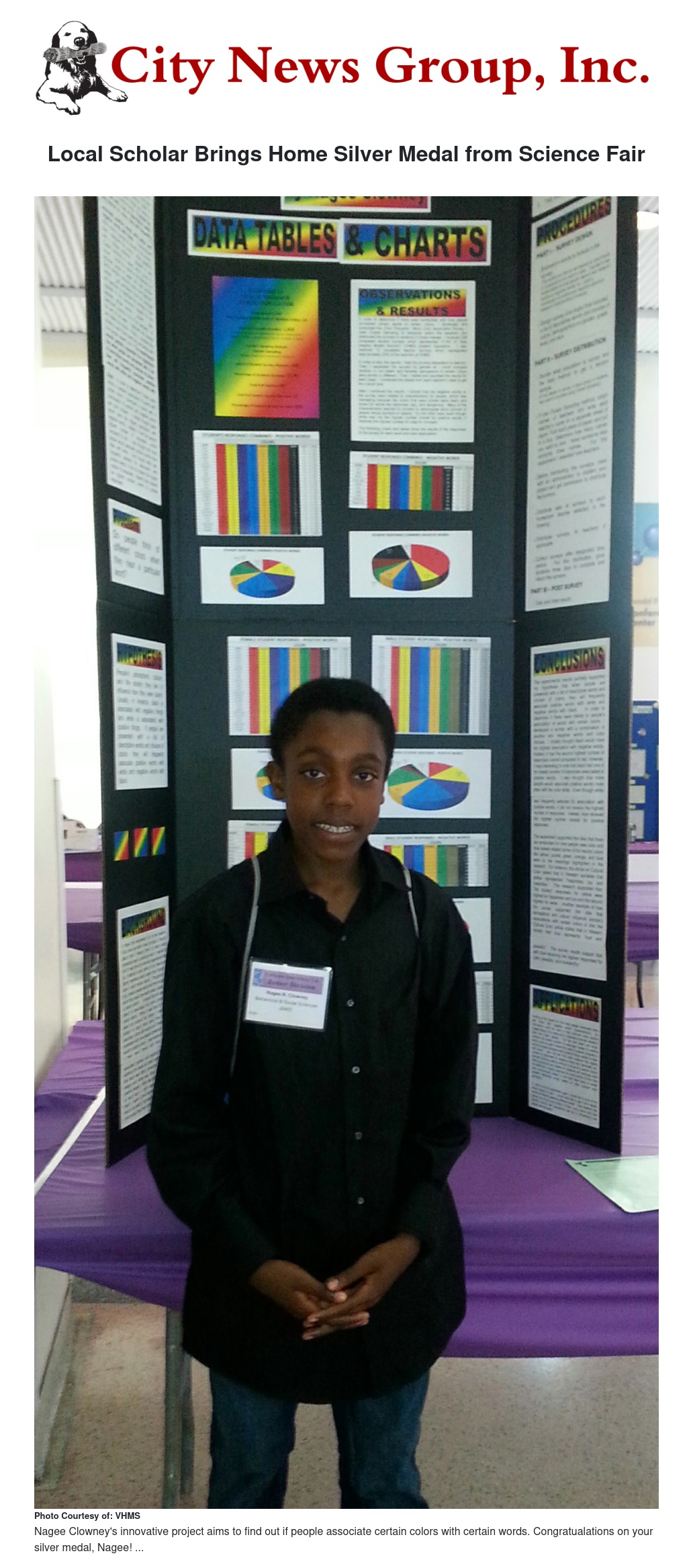 Vista Heights Middle School student Nagee Clowney wondered whether people associate words and colors, so he created a science experiment to find out; his experiment earned him a gold medal at the Inland Science and Engineering Fair in San Bernardino and a silver medal at the California State Science Fair, held at the California Science Center in Los Angeles.
