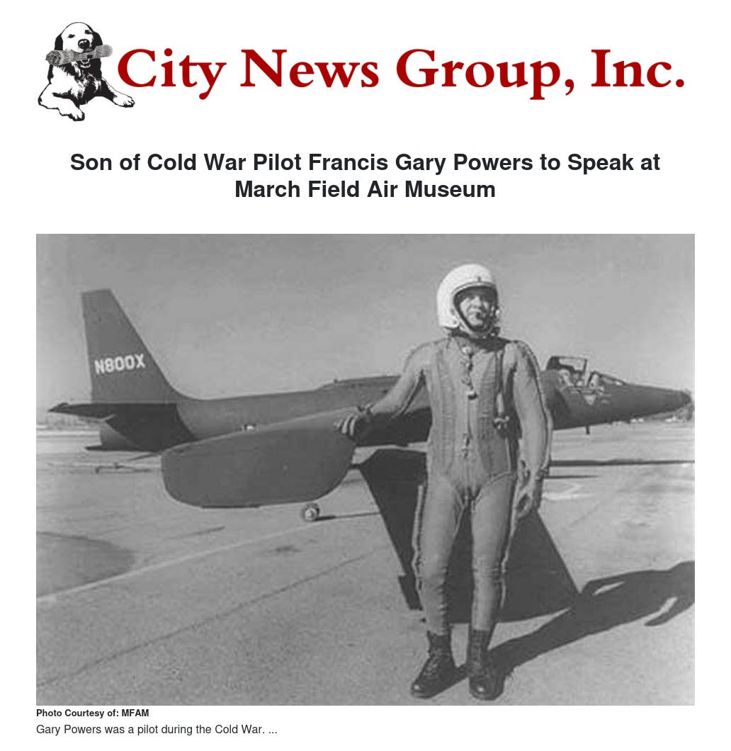 Saturday July 12, 2014 at 1 p.m. March Field Air Museum will present a one-hour briefing on the Cold War by Francis Gary Powers Jr., the son of Francis Gary Powers the American U-2 pilot shot down in 1960 in a reconnaissance mission over Russia that derailed an important summit meeting between President Dwight D. Eisenhower and Soviet leader Nikita Kruschchev.