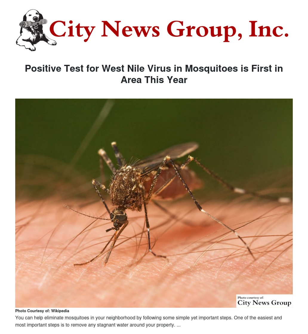 Positive Test for West Nile Virus in Mosquitoes is First in Area This Year