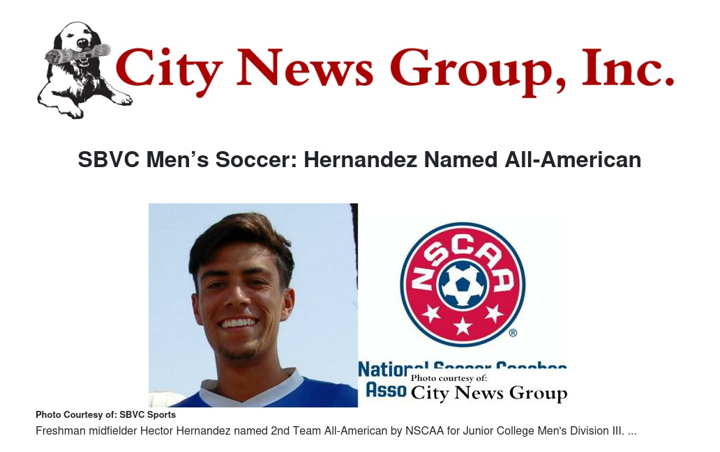 Freshman midfielder Hector Hernandez (Moreno Valley Canyon Springs) had the prestigious honor of being named 2nd Team All-American by NSCAA for Junior College Men's Division III. In addition, Hernandez was also named 1st Team All-West Region by NSCAA for Junior College Men's Division III. This is the first time that an SBVC Men’s Soccer player has been named to either of these awards.