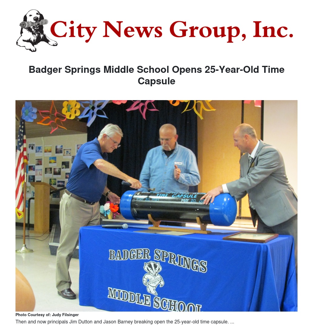 The staff, students, parents, and alumni of Badger Springs Middle School received a nudge to remember, Tuesday evening, June 3rd, when they witnessed the opening of a time capsule sealed on May 20, 1989. The capsule had been housed since then, for 25 years, in a display case at the school.