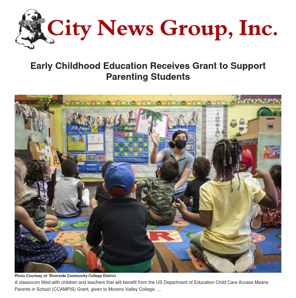 Moreno Valley College received a US Department of Education Child Care Access Means Parents in School (CCAMPIS) Grant to support Pell-eligible parenting students with free care in the Center. The funding is for four years at $90,000 annually.