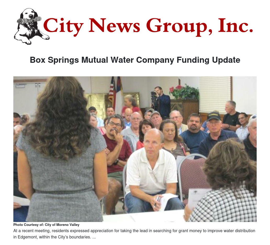 “The residents of Edgemont are very eager to become involved in helping to find a solution to their longstanding problems with the water delivery system. They are very appreciative of the City’s efforts to engage them in a manner they can understand. The language barrier some have is no longer a problem thanks to Councilmember Baca’s recognition that there needed to be a bilingual public outreach program,” Kennedy said. Kennedy also praised the Box Springs Mutual Water Company Board of Directors for their willingness to partner with the City to seek grant funding.
