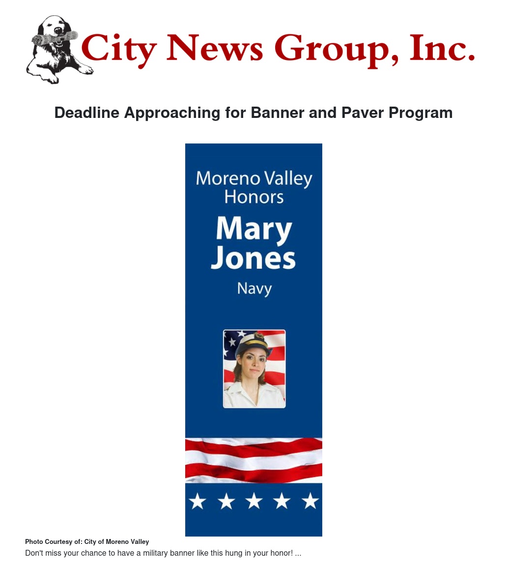 To recognize a veteran with this honor, please contact the City's Parks & Community Services Department at 951-413-3701.