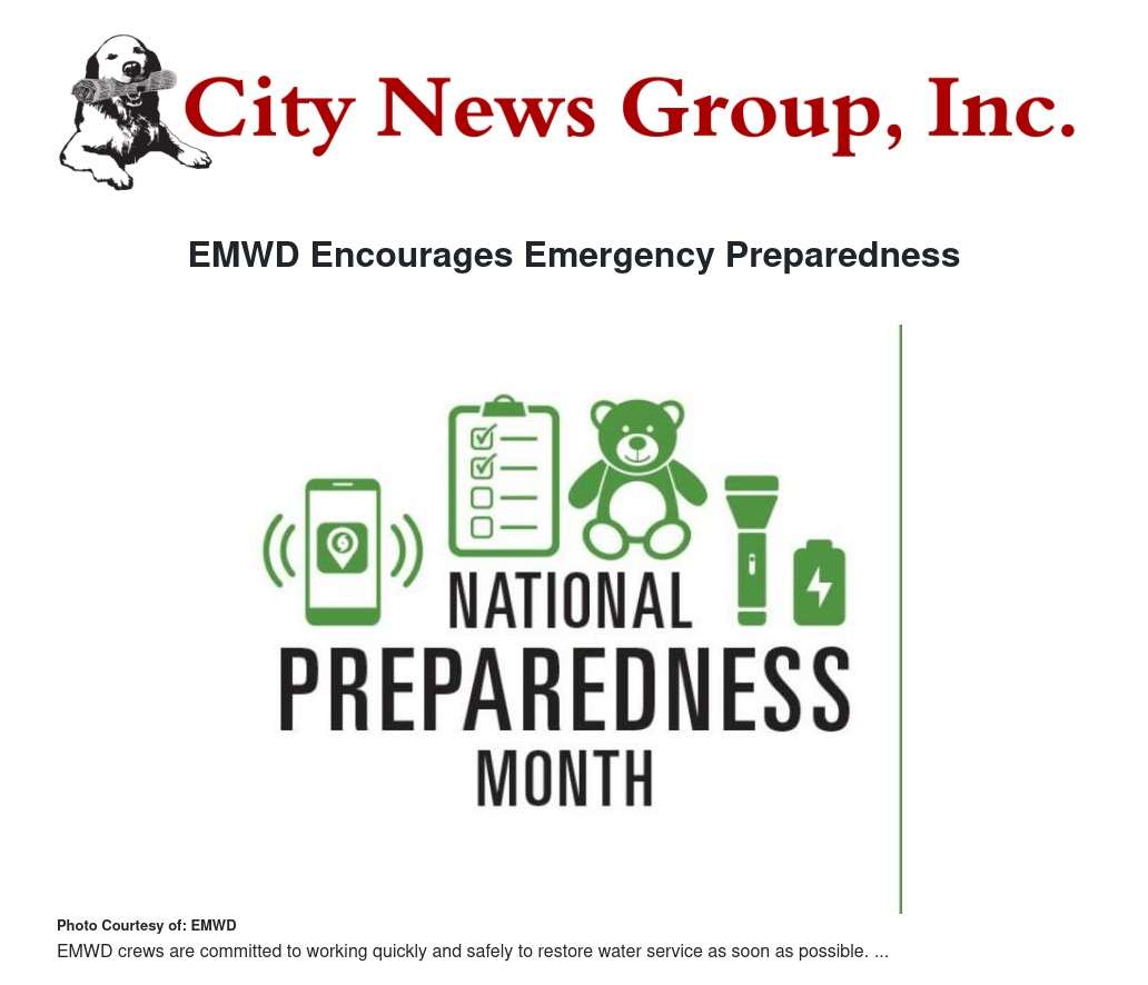 September is National Preparedness Month so Eastern Municipal Water District (EMWD) wants to take the opportunity to remind its customers of the importance of being prepared in the event of a major emergency – such as an earthquake – that could result in an extended interruption of water service.