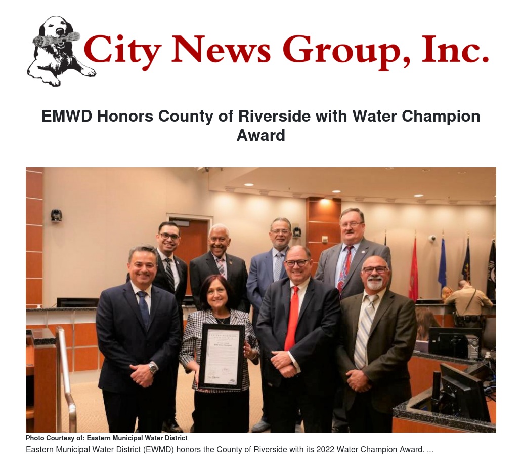 EMWD Honors County of Riverside with Water Champion Award by Alex Turner - City News Group, Inc.