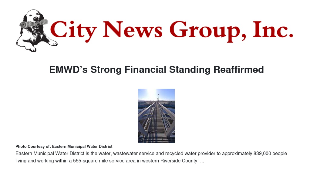 “EMWD is incredibly proud of its ratings with the major rating agencies and the direct benefit those provide to our customers,” EMWD Board President Ron Sullivan said. “Our customers have entrusted in us to be stewards of their funds, and we take that responsibility very seriously.”