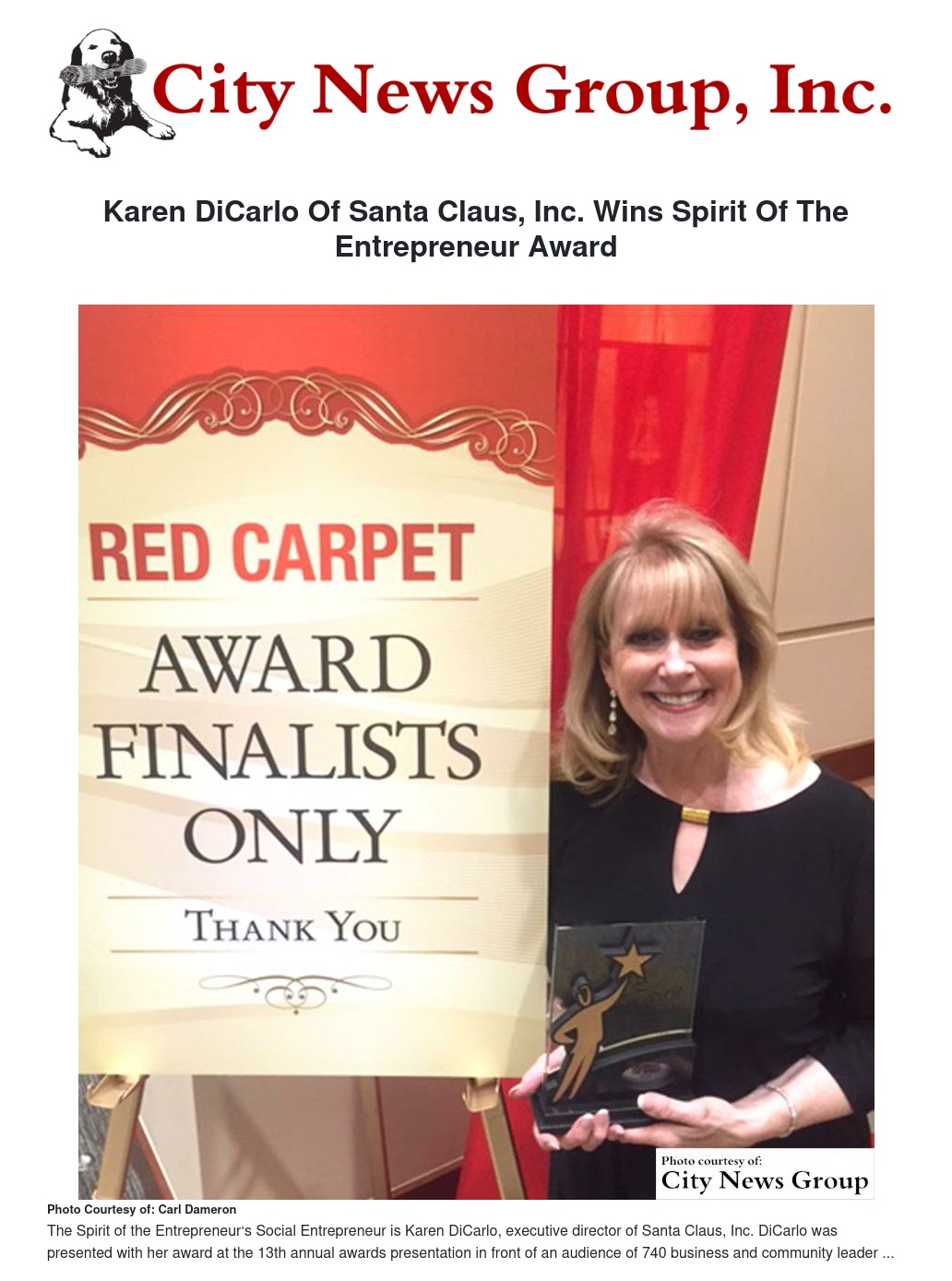 The Spirit of the Entrepreneur‘s Social Entrepreneur is Karen DiCarlo, executive director of Santa Claus, Inc. DiCarlo was presented with her award at the 13th annual awards presentation in front of an audience of 740 business and community leaders.