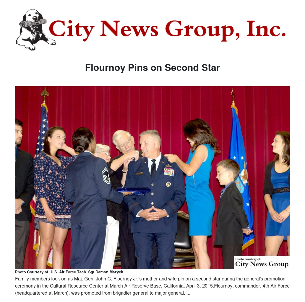 Maj. Gen. John C. Flournoy Jr., commander, Headquarters 4th Air Force, pinned on his second star Thursday during an on-base ceremony attended by his wife, Anne, his parents, retired U.S. Air Force colonel John Flournoy and Charlene Flournoy, and his four children, as well as friends, local dignitaries, community leaders and Team March members.