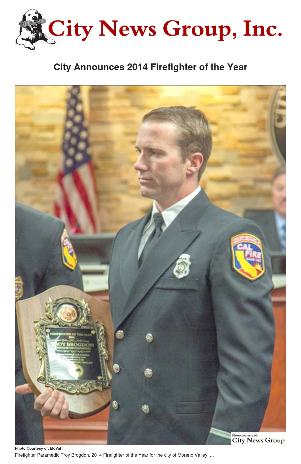 Moreno Valley's city Council, city staff, CAL FIRE/Riverside County Fire Chief John R. Hawkins and Moreno Valley Battalion Chief Mark Williams recognized Firefighter Paramedic Troy Brogdon as 2014 Firefighter of the Year for the city of Moreno Valley at the March 24 city Council meeting.