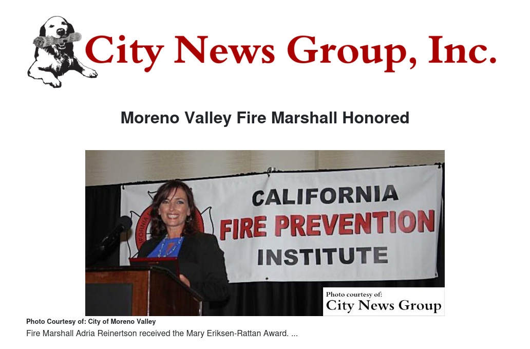 Moreno Valley>> Fire Marshal Adria Reinertson was recently honored with the Mary Eriksen-Rattan Award, an award with high regard.