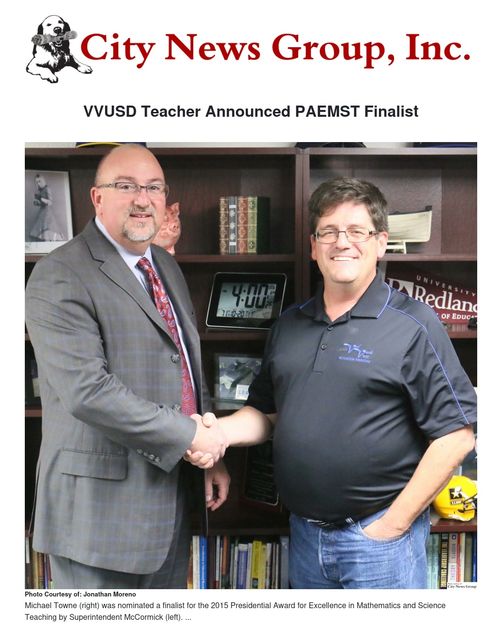 “Mr. Towne is an extremely gifted and passionate educator! Our students and teachers benefit from his wisdom and his infectious spirit. The Val Verde community is extremely proud of Mr. Towne’s accomplishments and wish him well as he advances in this prestigious competition,” said Superintendent Michael R. McCormick.