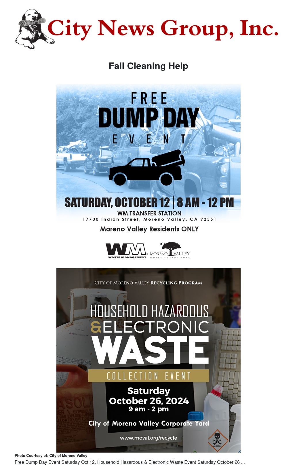 First, mark your calendars for our Free Dump Day on October 12 from 8 a.m. to 12 p.m. at the Waste Management Transfer Station, 17700 Indian St. Get rid of those large, bulky items that have been taking up space in your garage or backyard. There's no need to haul them to the dump by yourself—just bring them to our collection site, and we’ll take care of the rest!
