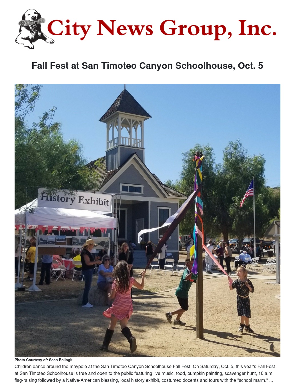 Heralding the season, Fall Fest at the San Timoteo Canyon Schoolhouse is Saturday, Oct. 5, from 10 a.m. to 2 p.m. The free event is open to the public and will feature a flag-raising ceremony, Native American blessing, self-guided tours of the schoolhouse hosted by the resident “school marm” and costumed docents, free pumpkin painting, scavenger hunt and crafts for kids, a maypole, live music, food truck, and a local history exhibit.