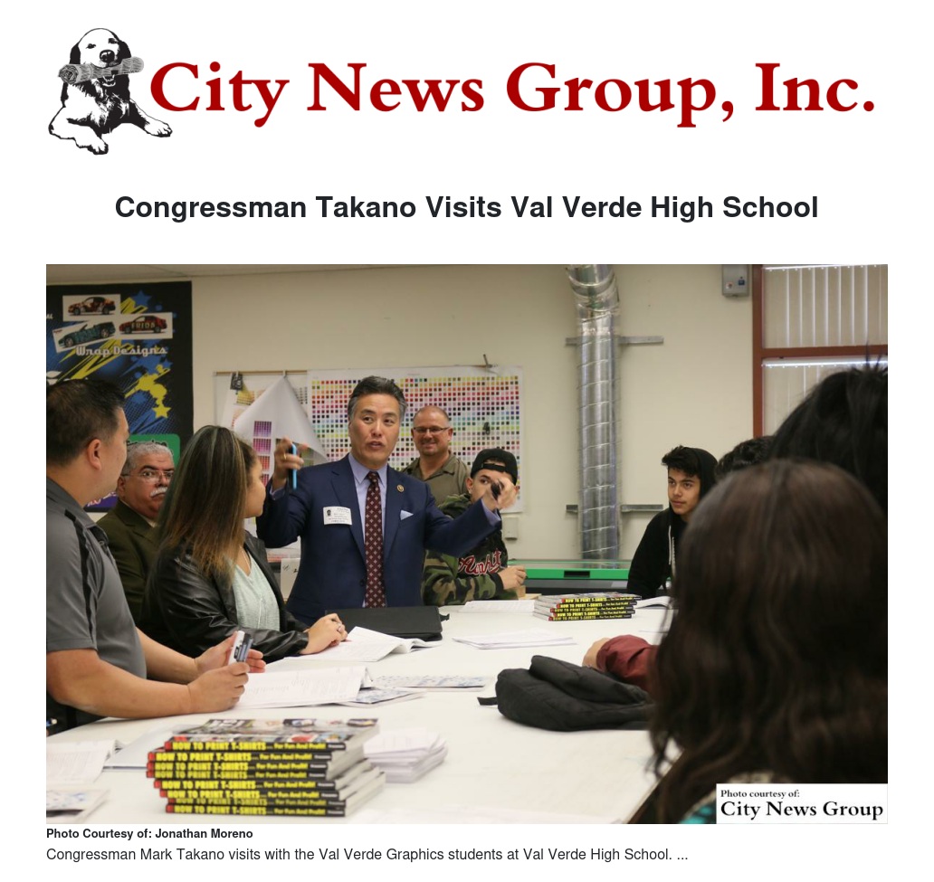 The Val Verde Unified School District Board of Education, Superintendent, and Val Verde High School invited the Congressman to visit the campus for a demonstration of the Val Verde Graphics, and Teen Vision Production programs. Congressman Takano has always been an advocate of Career Technical Education, which provides students of all ages with the academic and technical skills, knowledge and training necessary to succeed in future careers and to become lifelong learners.