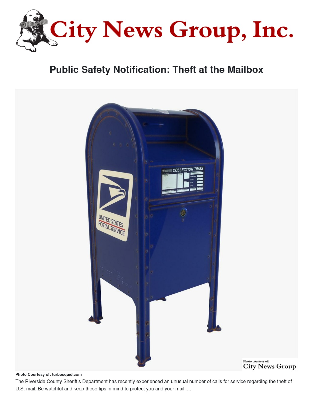 The Riverside County Sheriff’s Department has recently experienced an unusual number of calls for service regarding the theft of U.S. mail.