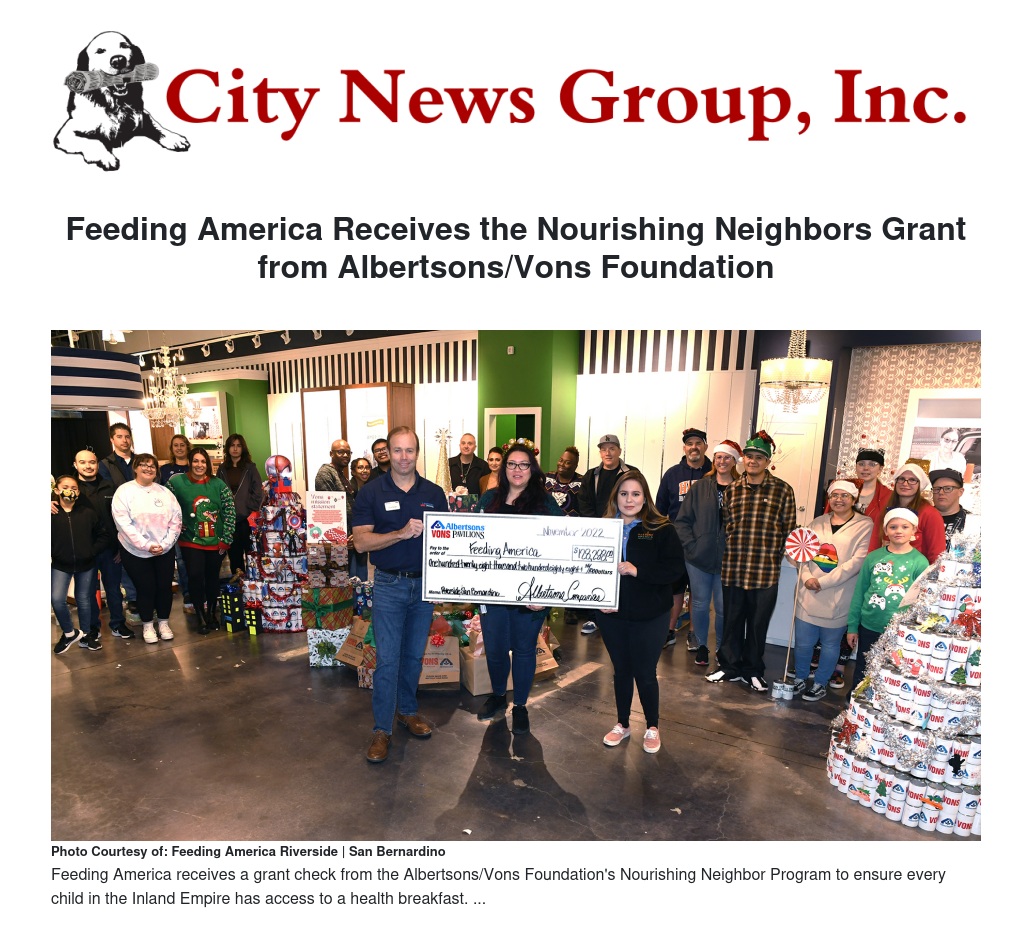 Feeding America Receives the Nourishing Neighbors Grant from Albertsons/Vons Foundation by Nancy Preciado - City News Group, Inc.