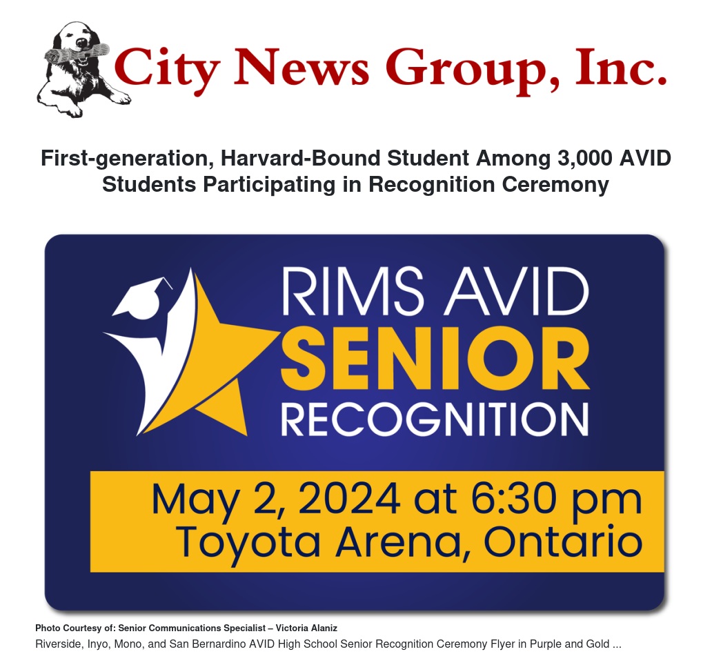 The RIMS AVID Senior Recognition Ceremony will not only honor Vasquez but also more than 3,000 students from across Riverside, Inyo, Mono, and San Bernardino Counties(RIMS). These students, representing over 20 school districts in the Inland Empire, including Needles Unified School District, Hesperia Unified School District, Chaffey Joint Union High School District and Perris Union High School District, have dedicated years to the AVID program, overcoming obstacles such as virtual learning, immigrant backgrounds, poverty, and foster care.