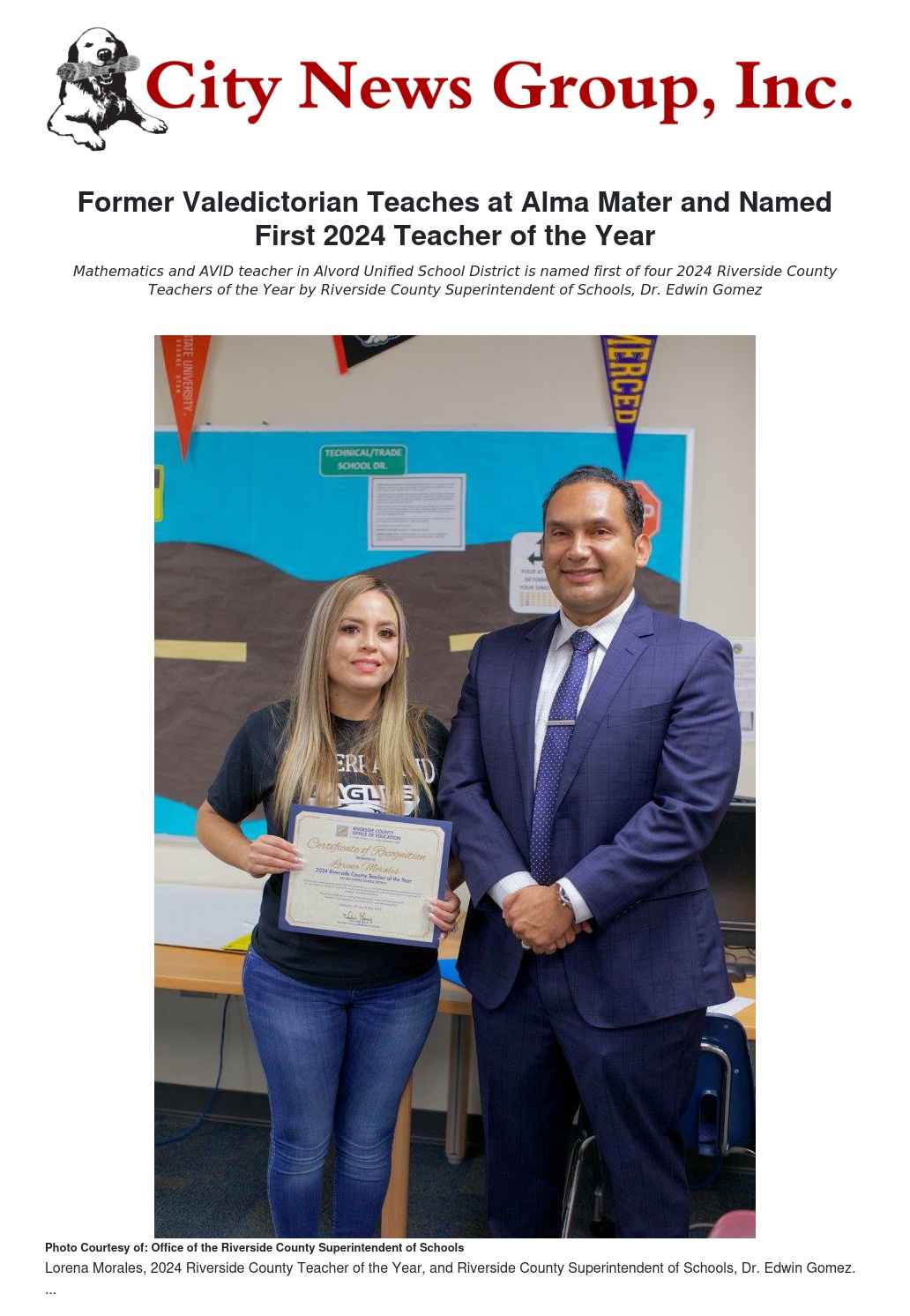 Lorena Morales will represent Riverside County in the 2024 California State Teacher of the Year competition later this year. Three more 2024 Riverside County Teachers of the Year will be revealed in upcoming surprise visits.
