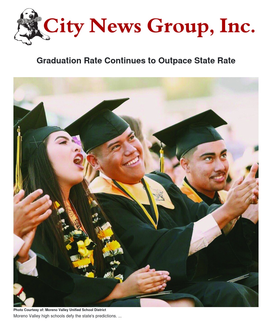 “The Board of Education is happy to see the new graduation rates and dropout rates for Moreno Valley Unified School District,” said Board President Susan Smith. “Our teachers, counselors and administration have worked extremely hard to ensure our students leave our district with a diploma in hand. This is something the entire community should be very proud of.”