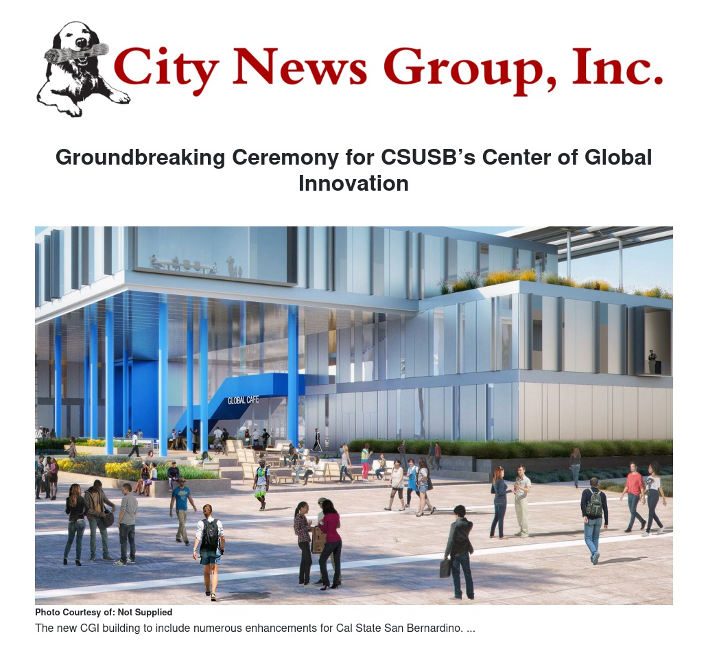 The College of Extended Learning at Cal State San Bernardino will host a groundbreaking ceremony for the new Center of Global Innovation (CGI) building. CGI, which was unanimously approved by the California State University Board of Trustees, will serve as the centerpiece to the central core of campus, enhancing student and academic life. The building is expected to open by fall 2019.