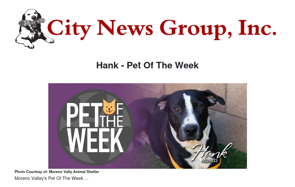 If you would like to make Hank or any pet from the Moreno Valley Animal Shelter part of your family, please contact the Moreno Valley Animal Shelter at 951.413.3790 or visit www.moval.org/pets.
