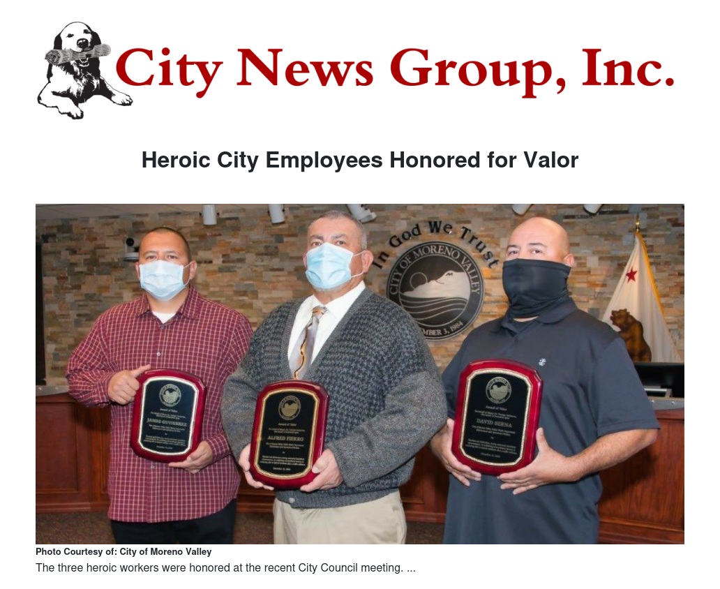 Three City of Moreno Valley employees have been honored for valor by the Mayor and City Council for actions they took while on duty that saved lives. On December 16, 2020, David Serna and Alfred Fierro provided emergency assistance to people involved in a serious traffic collision at the intersection of Kitching and Eucalyptus, while James Gutierrez took charge and redirected traffic until police could arrive.