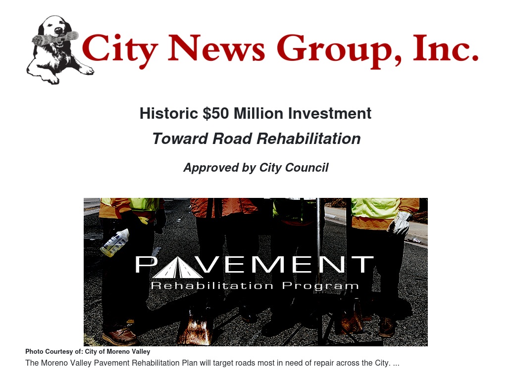 The Moreno Valley City Council approved a historic $50 million investment toward Citywide pavement rehabilitation, the most significant public works expenditure in Moreno Valley's history.