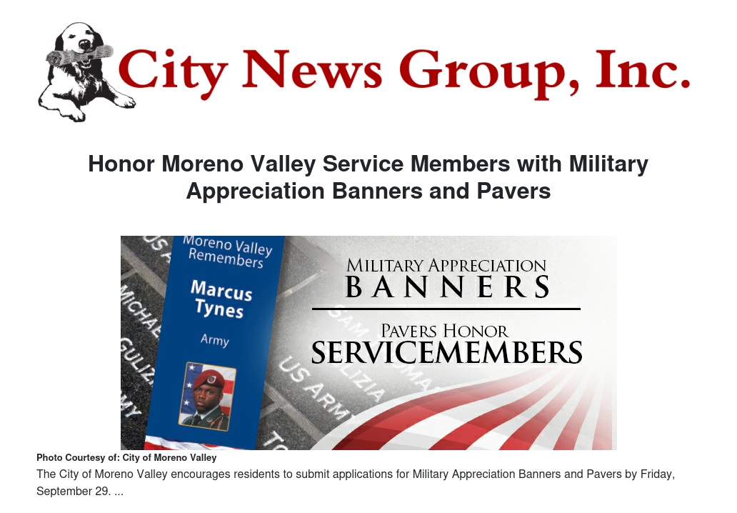 The City of Moreno Valley encourages residents to submit applications for Military Appreciation Banners and Pavers by Monday, April 17.