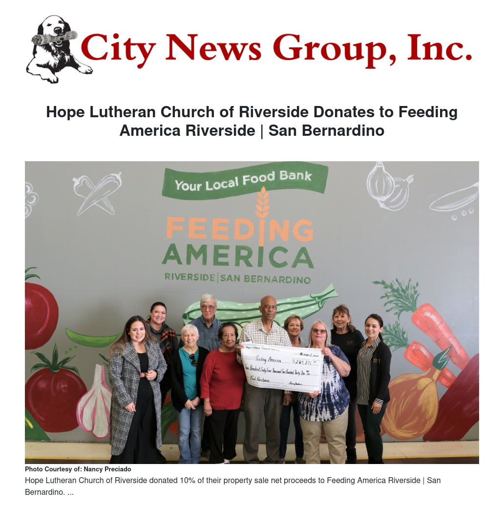 Hope Lutheran Church of Riverside Donates to Feeding America Riverside | San Bernardino by Nancy Preciado - City News Group, Inc.