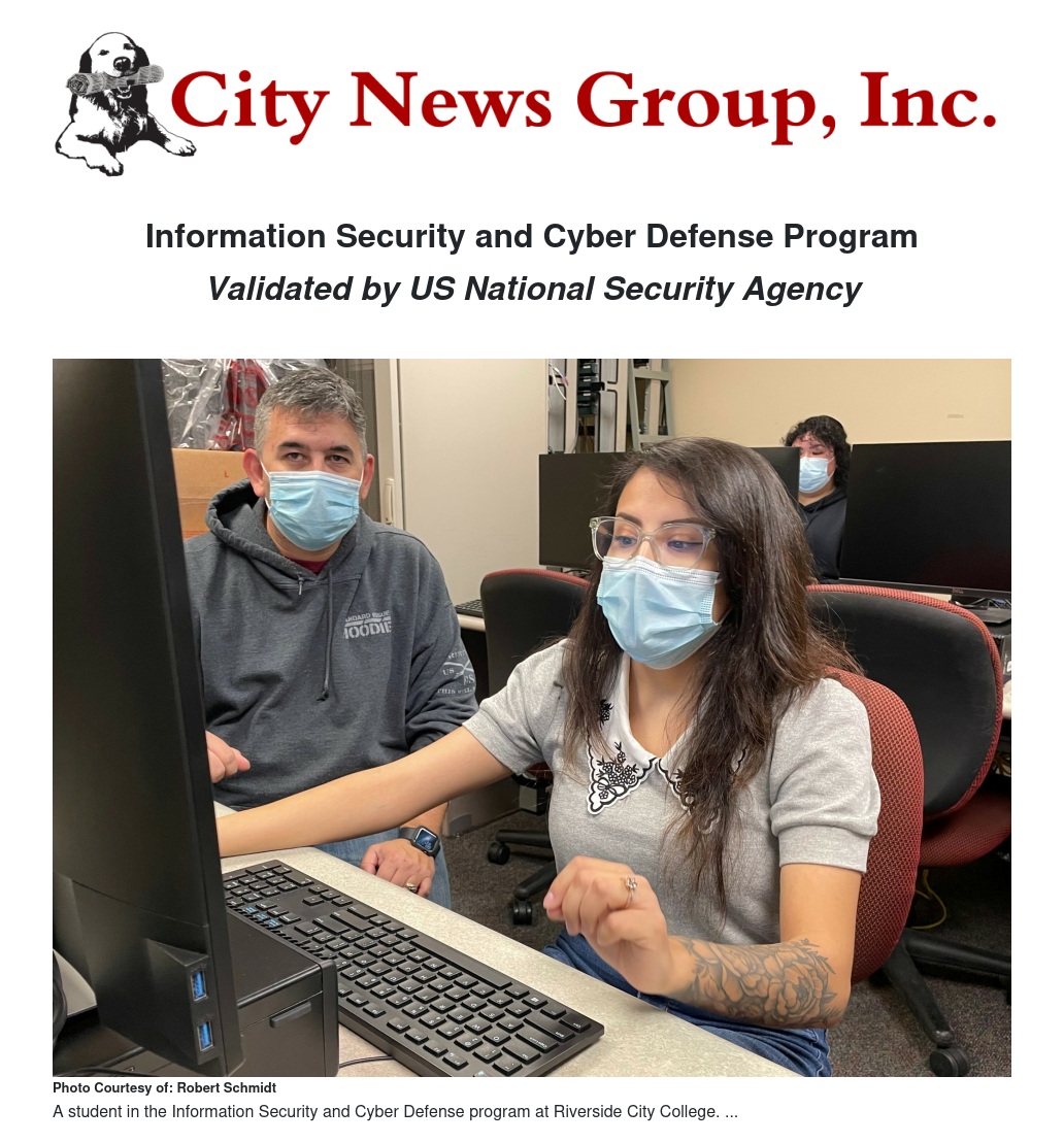 Riverside City College’s Information Security and Cyber Defense program has achieved CAE-CD validation from the National Science Agency (NSA) and Department Homeland Security (DHS).