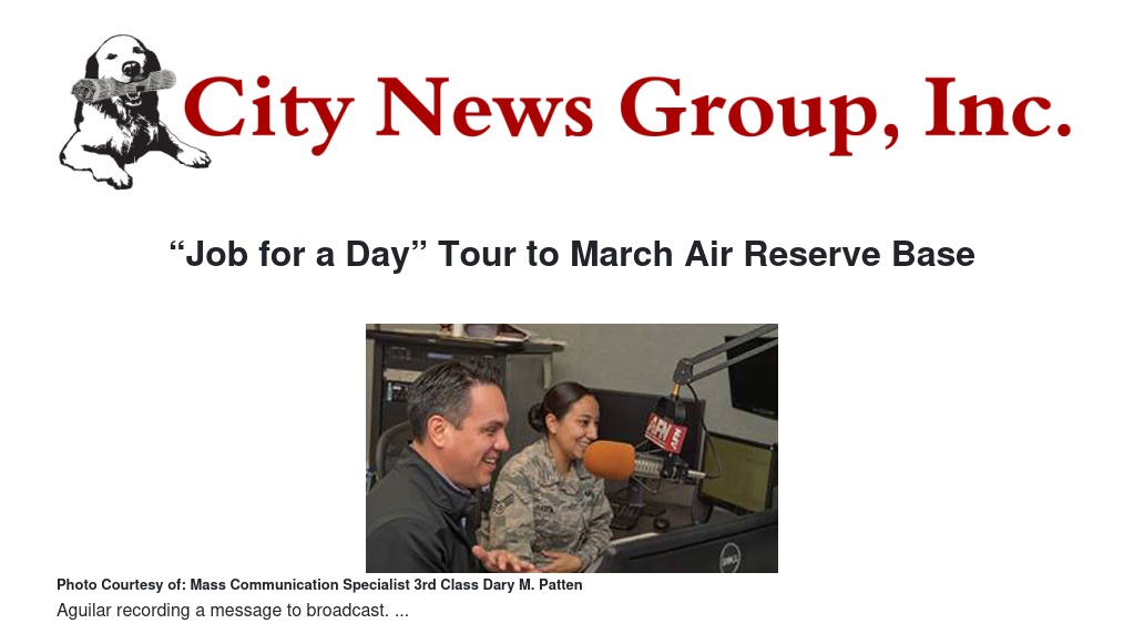 Rep. Aguilar took his Job for a Day tour of the Inland Empire to March Air Reserve Base, where he learned how to record, edit and upload audio files for Armed Forces Network (AFN). AFN provides radio and television news and entertainment for active, guard, and Reserve military service members, and their families overseas. AFN reaches US military audiences in 168 countries, as well as Navy and Coast Guard ships around the world. In addition to learning firsthand about the work of an AFN Radio Specialist, Rep. Aguilar recorded a brief radio message to thank deployed service members and their families.