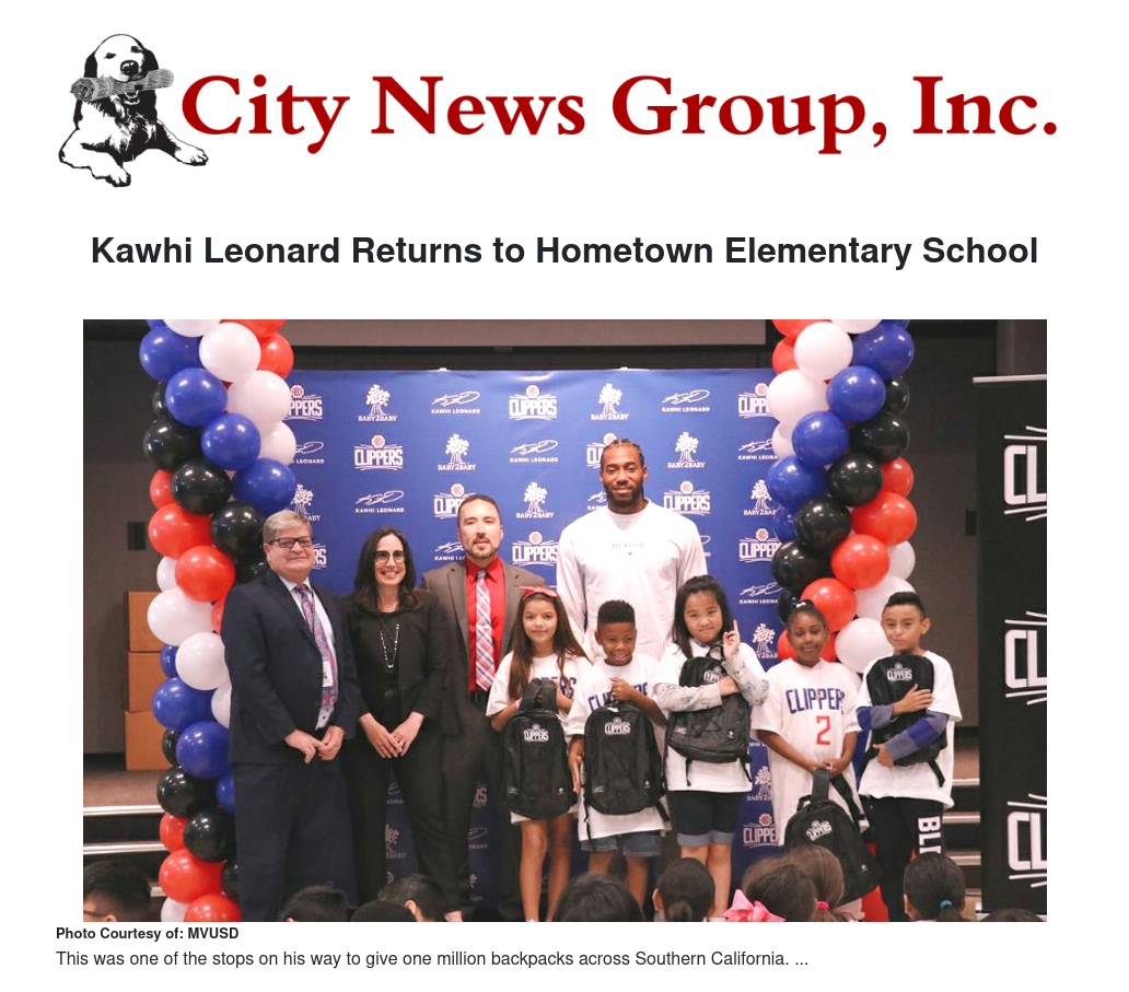 “We are deeply honored and touched by Kawhi Leonard of the L.A. Clippers for coming back to his hometown of Moreno Valley to give back to Cloverdale Elementary School where it all got started,” said Superintendent Dr. Martinrex Kedziora. “It was a transformational experience for all students who received backpacks and had a chance to meet him in person.”