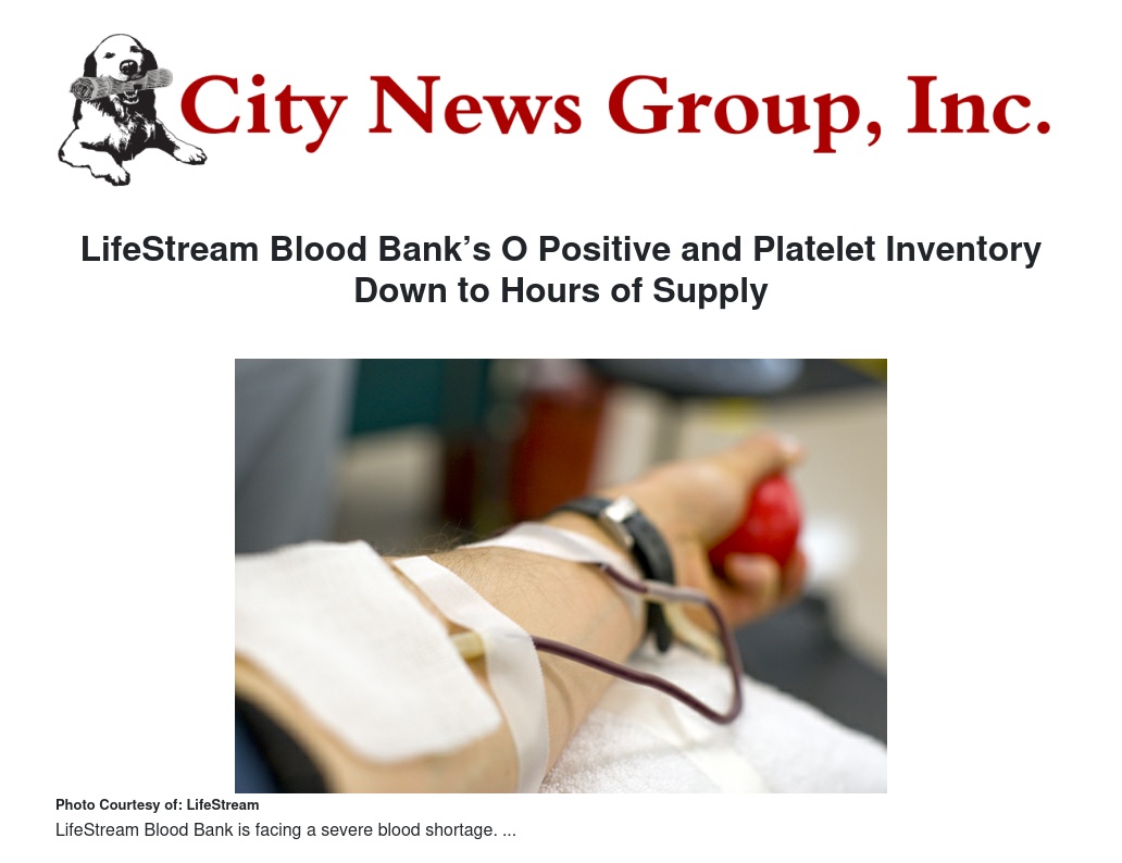 “We are down to hours of supply,” said Dr. Rick Axelrod, LifeStream’s president/CEO & medical director. “What is extremely concerning is we do not have enough O-positive blood on our shelves for our local hospitals. We will not be able to meet the needs of local hospital patients if we don’t receive more blood donations from local residents. O-positive blood is the most needed blood type because it is the most common blood type. We urge anyone who is healthy, feeling well, and able to donate blood to give blood at a LifeStream donor center or mobile drive. You are needed now to help friends, family, and fellow residents who require blood products for lifesaving treatments.”