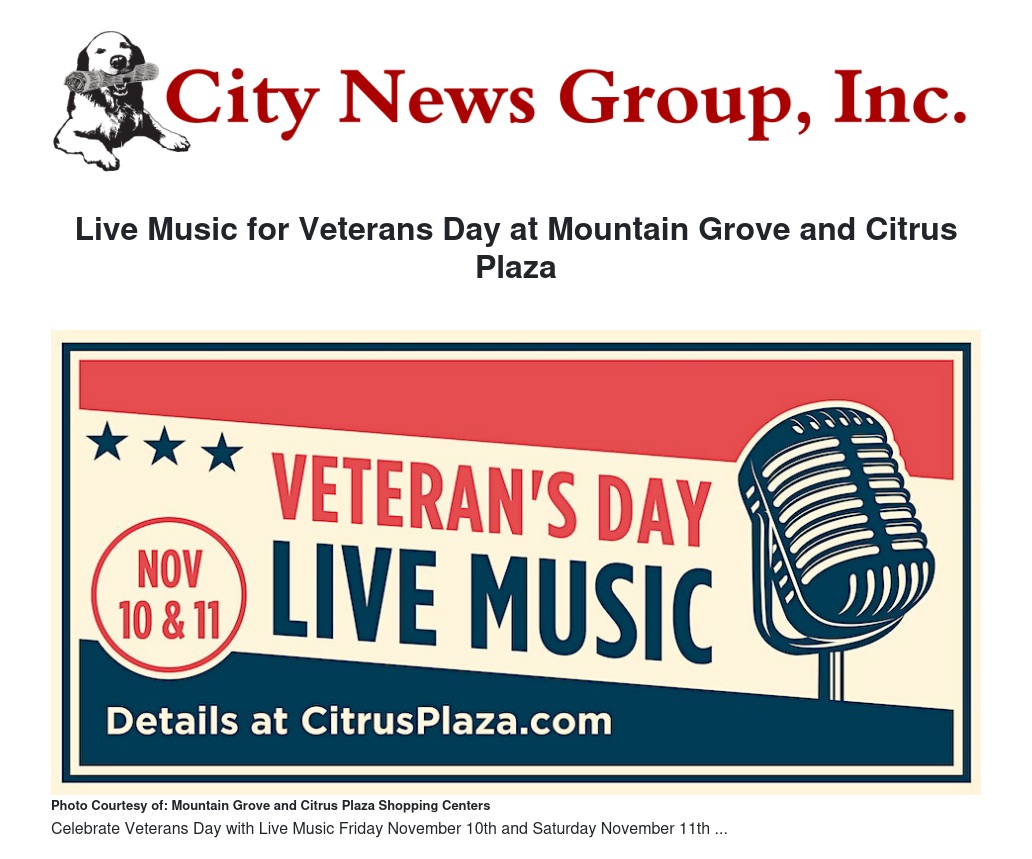 Celebrate the Holiday with some live music Friday, November 10th at Mountain Grove Food Court and Saturday, November 11th at Citrus Plaza Food Court. (Citrus Plaza Shopping Center and Mountain Grove Shopping Center 27530 West Lugonia Avenue Redlands, CA 92374)