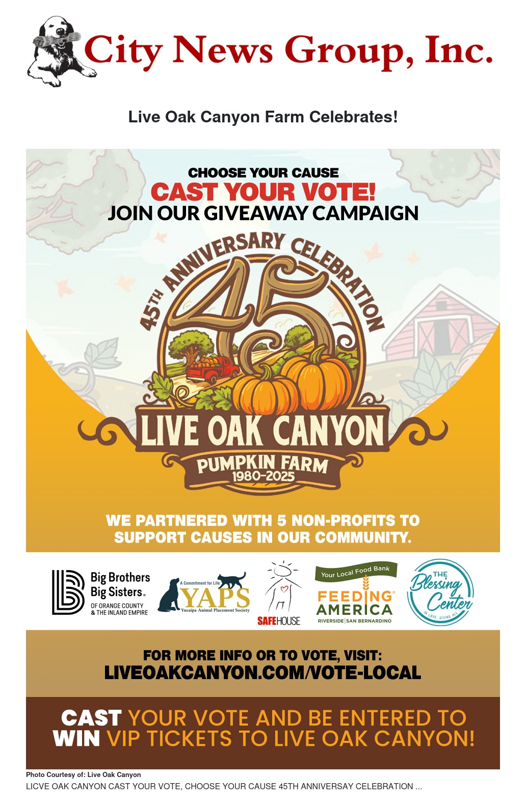 Live Oak Canyon Farm, a cherished Inland Empire landmark synonymous with fall fun and festive winter traditions, announces the launch of its "Choose Your Cause, Cast Your Vote" giveback campaign. This new initiative invites the community to support five vital local non-profit organizations, reinforcing the farm's deeprooted commitment to giving back.