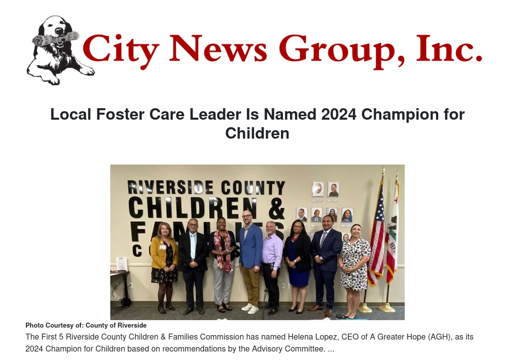 The First 5 Riverside County Children & Families Commission has named Helena Lopez, CEO of A Greater Hope (AGH), as its 2024 Champion for Children based on recommendations by the Advisory Committee.