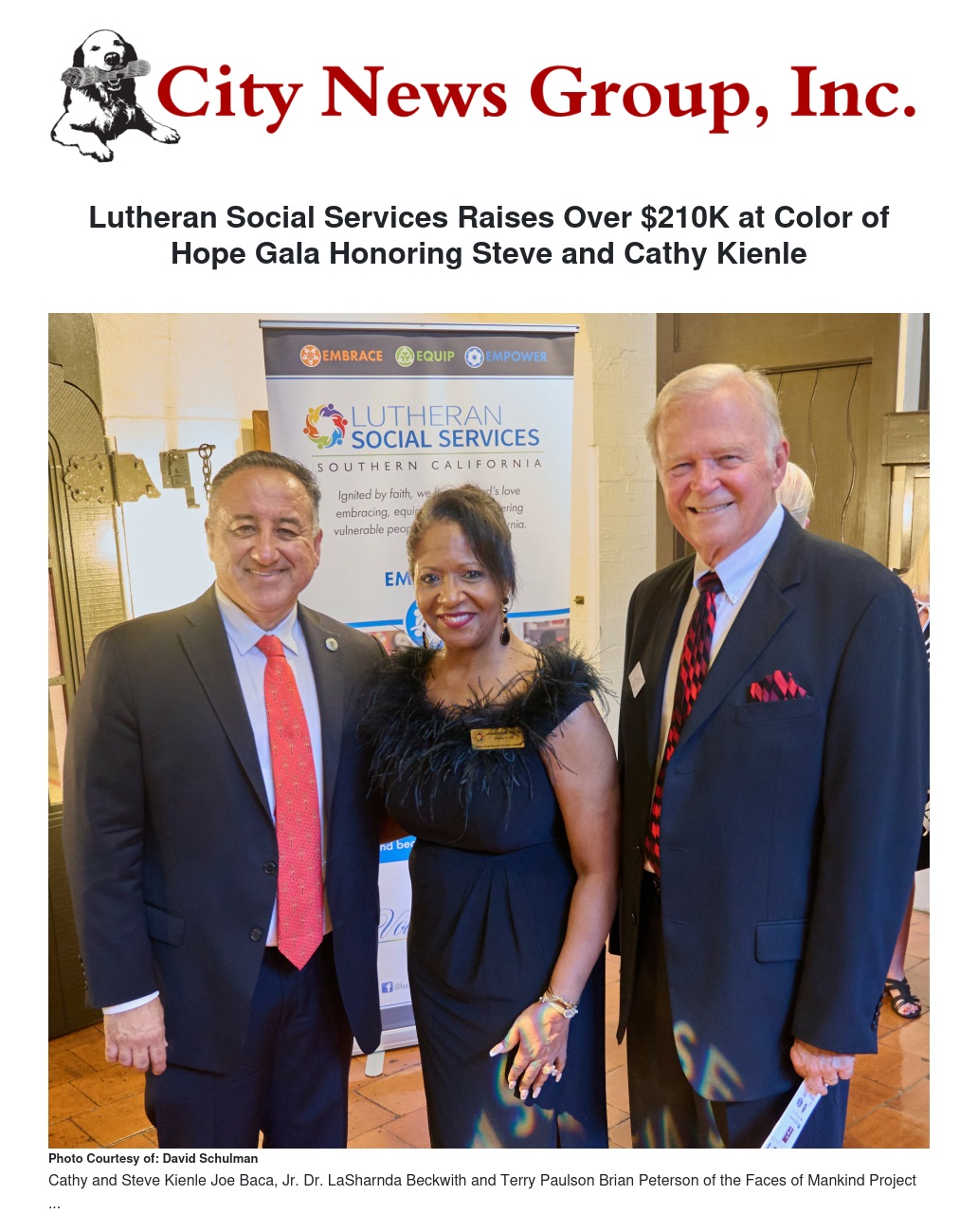 Lutheran Social Services of Southern California (LSSSC) - a leading provider of social services programs in Southern California – raised over $210K at its Color of Hope Gala & Awards on October 7 among 215 guests. The elegant affair held at the historic Mission Inn in Riverside honored Steve and Cathy Kienle of Walter’s Automotive and featured a moving art project by Brian Peterson of Faces of Mankind.